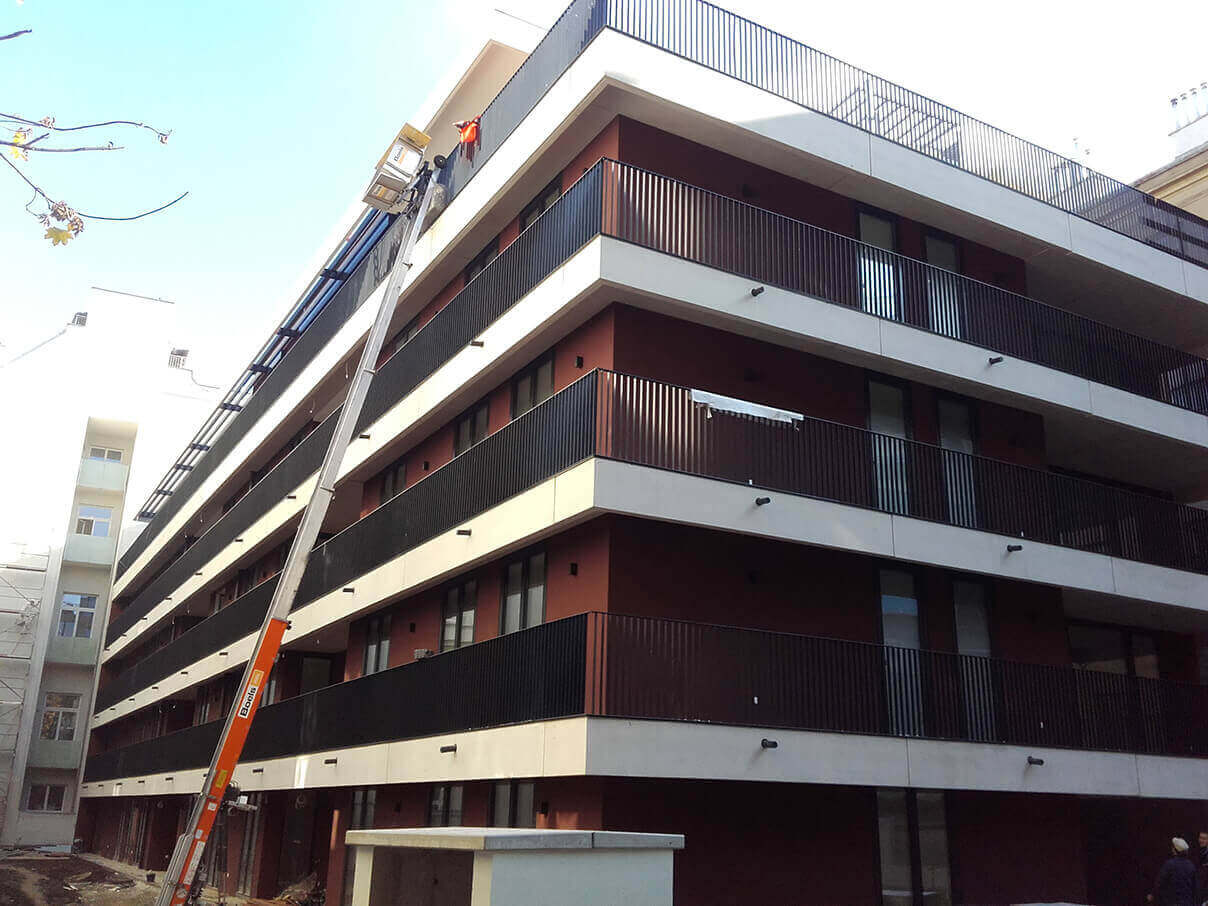 Errichtung einer unterkellerten Wohnhausanlage mit 75 Wohnungen. Der gesamte Gebäudekomplex gliedert sich in einen bestehenden Straßentrakt und drei neu zu errichtende Bauteile im Innenhof. Die Bauteile im Innenhof werden durch eine eingeschoßige Tiefgarage mit insgesamt 73 Pflichtstellplätzen unterkellert.